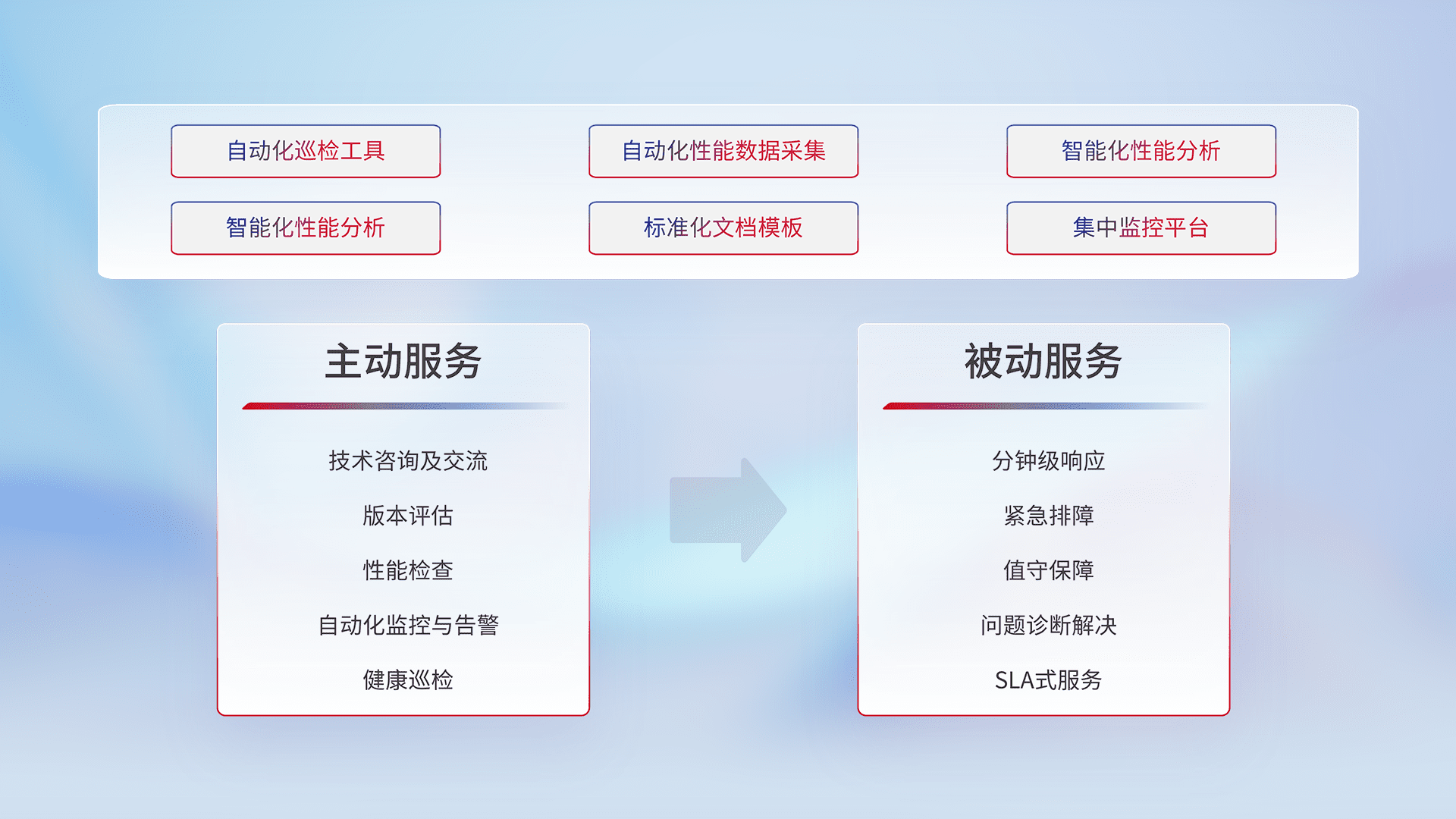 智能化工具和标准化文档,,,,保障服务质量,,,提供主动服务(包含技术咨询、、版本评估、、、性能检查、、、、自动化监控与告警、、、、健康巡检)和被动服务包含(分钟级响应、、紧急排障、、、、值守保障、、、问题诊断解决、、、SLA服务)。。。。